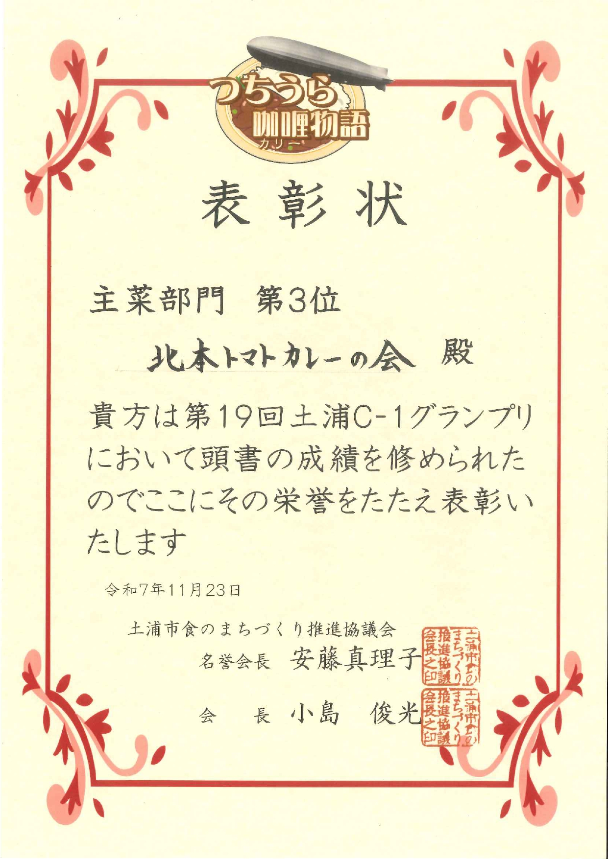 11月22日(土)・23日(日)に行われた、第22回土浦カレーフェスティバル「C-1グランプリ」にて、北本市のご当地グルメ「北本トマトカレー」が、第3位を受賞しました。